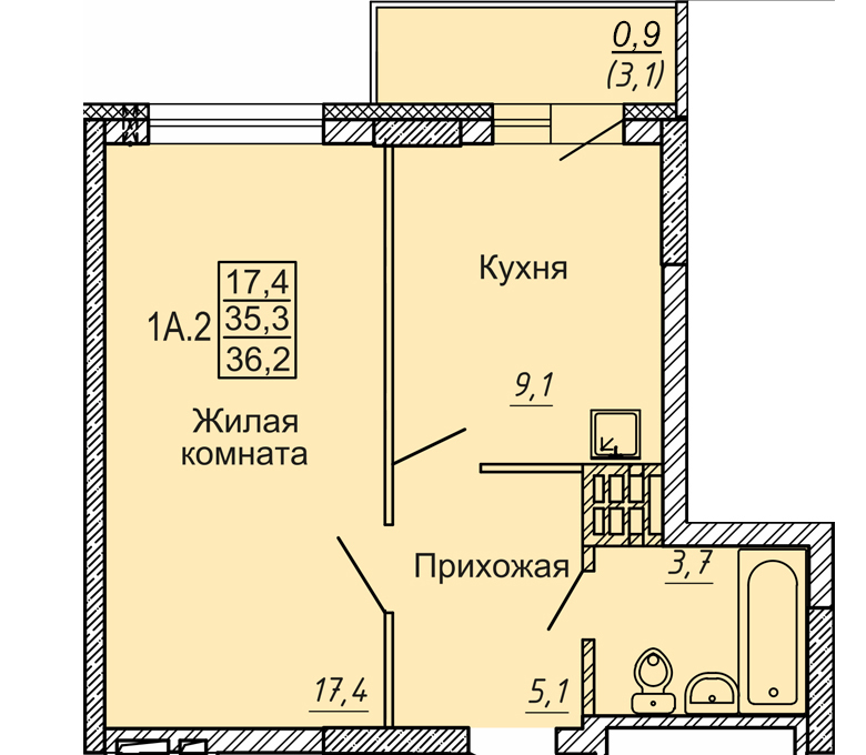 - 1 комн. 35,60 м² блок секция 3 в ЖК Новые Матрешки
