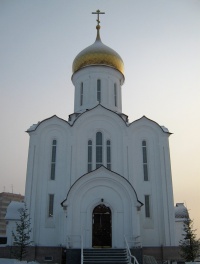 Небольшая деревянная церковь простой архитектуры с щипцовыми завершениями фасадов и декоративным пятиглавием, сооруженная в 1989-1991, одной из первых в Новосибирске.